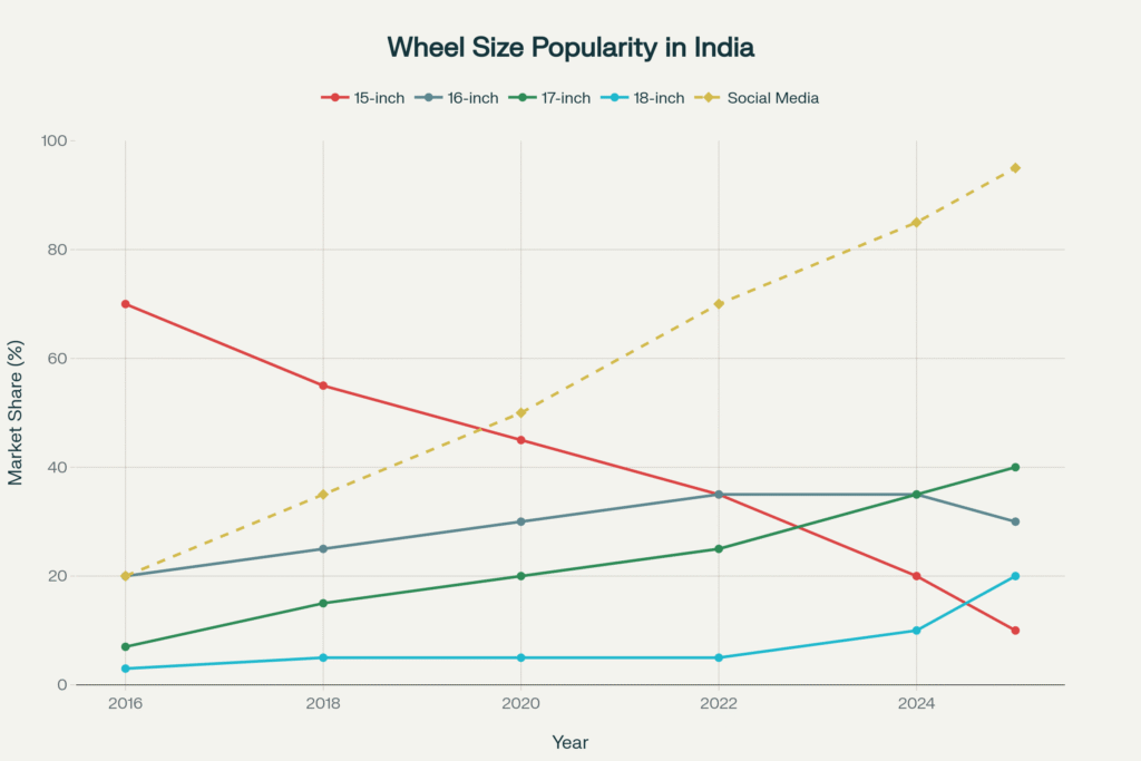 A decade ago, a 17-inch wheel was considered premium; now it’s almost standard on mid-range sedans and compact SUVs. If we plot this shift on a trend graph, the curve steadily climbs from 2016 and spikes dramatically around 2022–2024. The introduction of new SUVs every quarter — Creta, Seltos, Jimny, XUV700, Nexon, Fronx, and more — has pushed sizes like 215/60R17, 235/60R18, and 255/50R19 into everyday demand. What once sold in single digits now moves in hundreds across major cities.