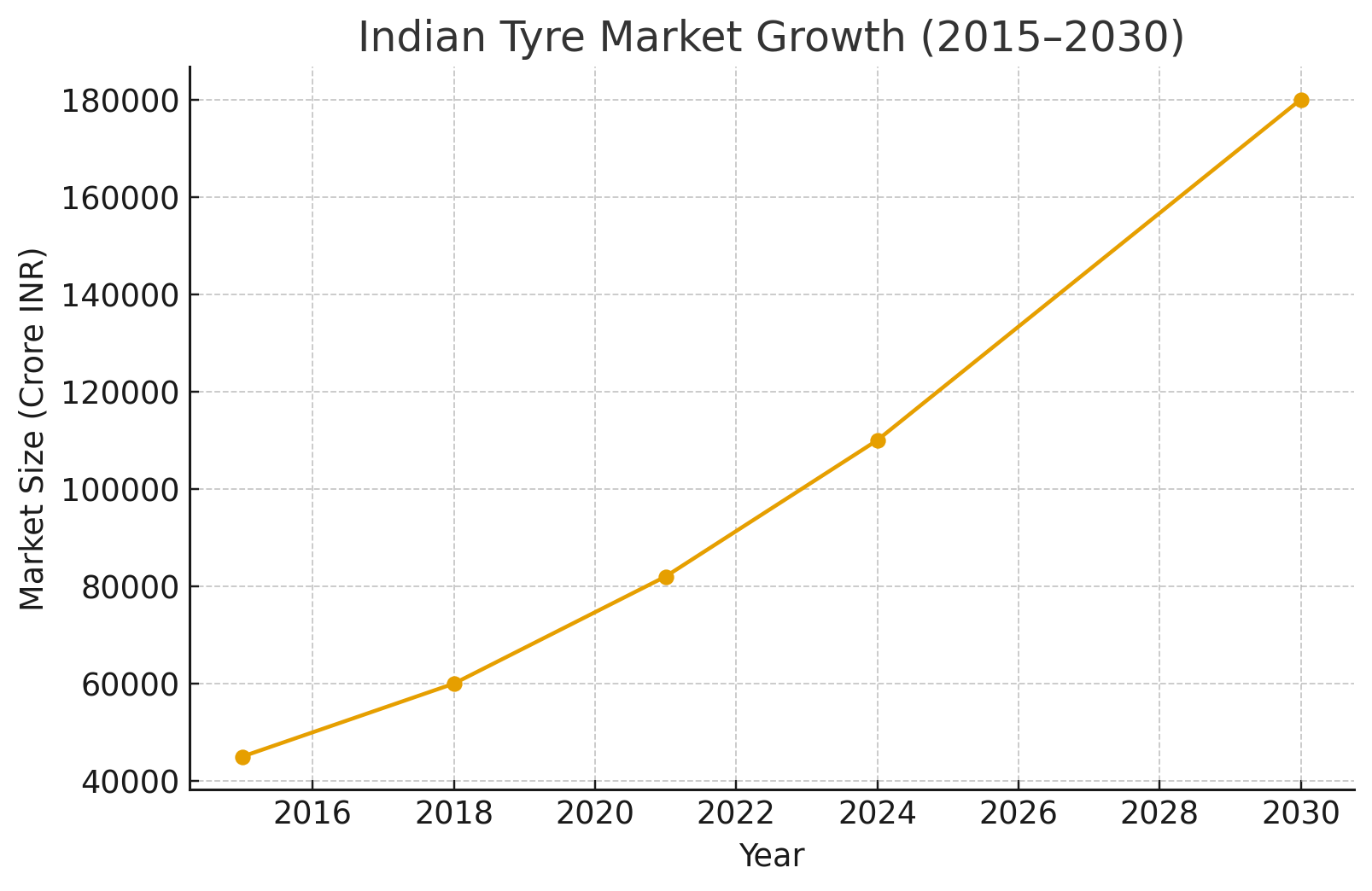 If you look at the recent industry numbers, India’s tyre market crossed ₹78,000 crore in 2024, growing at an average of 8–10% annually. Much of this growth comes from the replacement segment, which now contributes nearly 70% of total sales. Passenger car radial (PCR) tyres alone account for over 23% of the market, with demand rising especially in the 15–17 inch category, mainly because new cars now come with larger stock wheels.